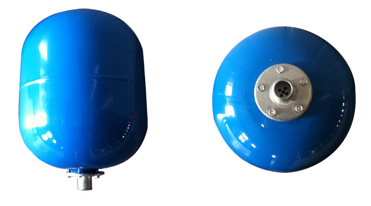 供水压力罐是由钢质外壳,橡胶气囊内胆构成的储能器件,橡胶气囊把水室和气室完全隔开。当系统压力降低时,预充氮气的压力将气囊里的水挤入系统,减缓系统压力降低,起到稳压作用;当系统压力升至高于气室里氮气的压力时,水进入膨胀罐的气囊中,此时气囊膨胀,吸收压力,防止系统压力急剧上升,起到稳定系统压力作用。